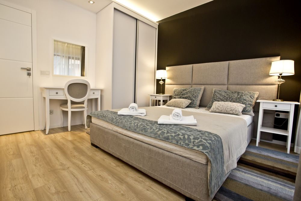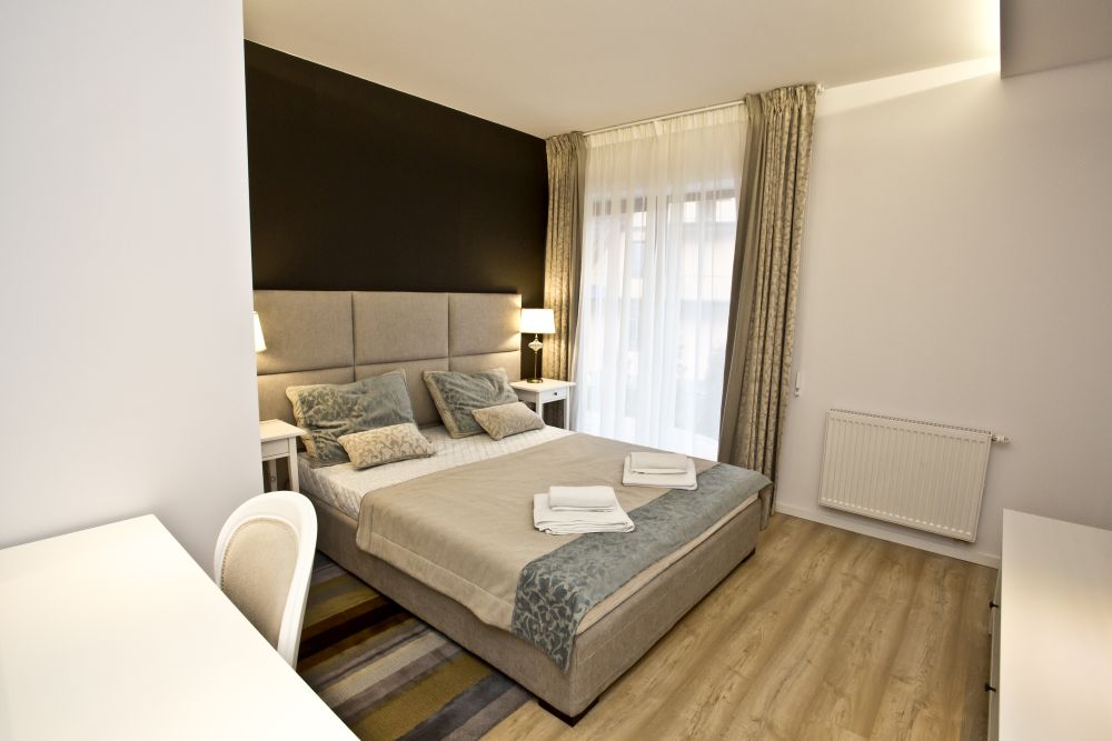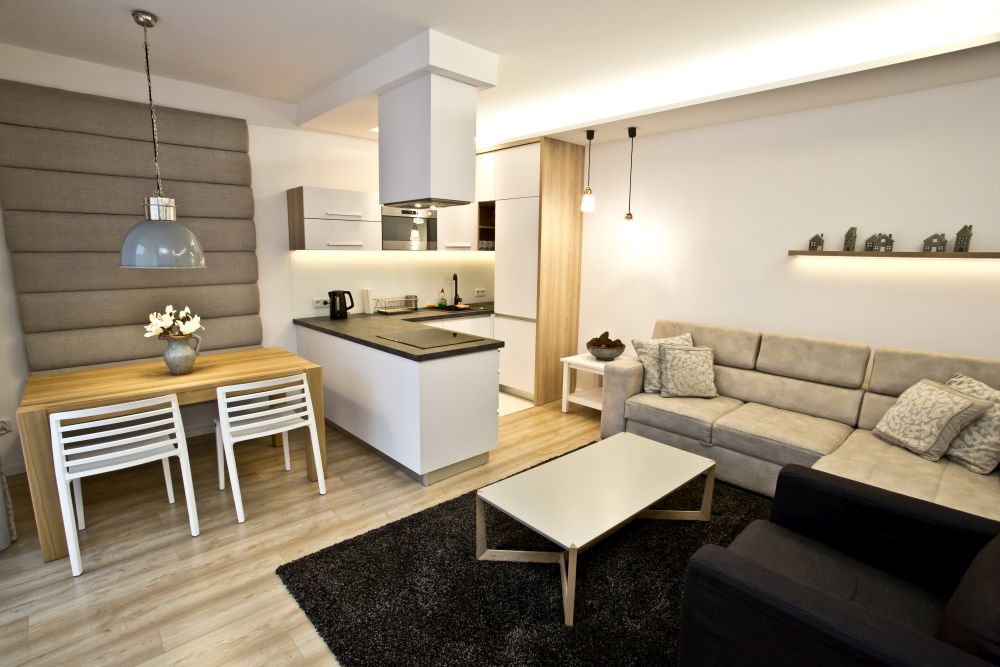 Apartament Pajo to ekskluzywny apartament, o wielkości 50 metrów kwadratowych, dla maksymalnie czterech osób. Składa się on z dużego, jasnego i przestronnego salonu połączonego z wygodnym aneksem kuchennym, oddzielnej przytulnej sypialni oraz łazienki. Salon został utrzymany w jasnej kolorystyce z czarnymi dodatkami. Dzięki temu mieszkanie sprawia wrażenie przytulnego i zarazem eleganckiego. Połoczany z salonem został w pełni wyposażony aneks kuchenny. Znajdziecie w nim państwo dużą lodówkę z zamrażalka, płytę indukcyjna, mikrofale z funkcją piekarnika oraz wszelkiego rodzaju naczynia, garnki , szkło, sztućce i inne niezbędne przyrządy do przygotowania posiłków.