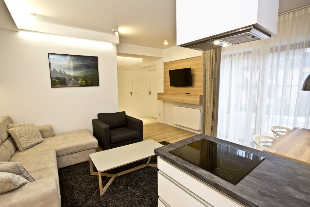 W salonie znajduje się duża wygodna rozkładana dwu osobowa kanapa, która za dnia pełni funkcje wypoczynkową a wieczorem może służyć jako miejsce do spania dla dwóch osób. Sypialnia została wyposażona w wygodne duże łózko małżeńskie, obszerną szafę na ubrania oraz Tv. Apartament znajduje się na parterze budynku, bezpośrednio z salonu wyjście na duży taras ( 20m2), z którego możecie Państwo podziwiać majestatyczny Giewont. Z sypialni wyjście na balkon z widokiem na Gubałówkę i Polane Szymoszkową. Serdecznie Zapraszamy!