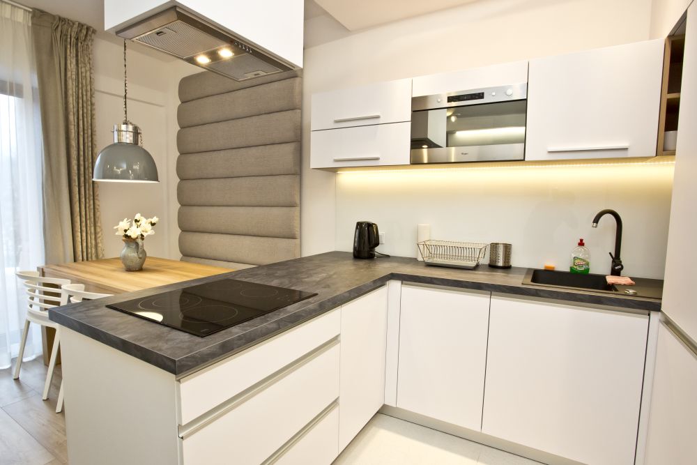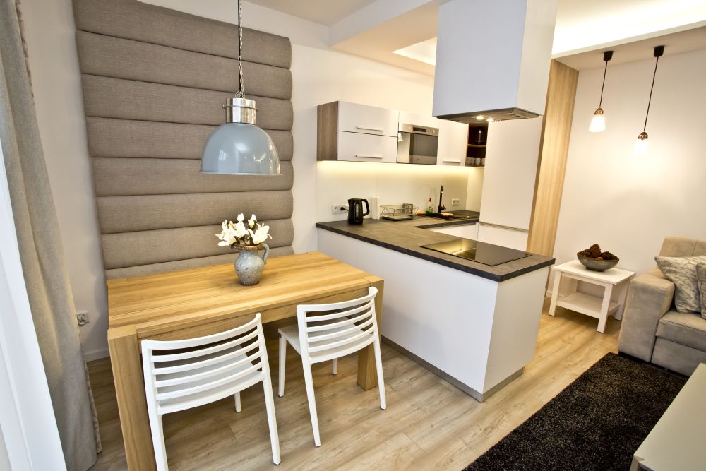 - Kuchnia: Elegancki i przede wszystkim nowoczesny aneks kuchenny jest w pełni wyposażony w niezbędny do gotowania i spożywania posiłków sprzęt: płytę grzewczą, nowoczesną zmywarkę, lodówkę, piekarnik z termoobiegiem, ekspres ciśnieniowy, czajnik elektryczny, blender, toster, komplet garnków, sztućców i talerzy.