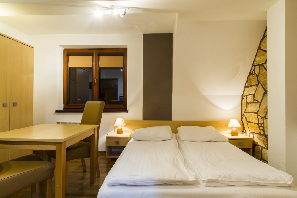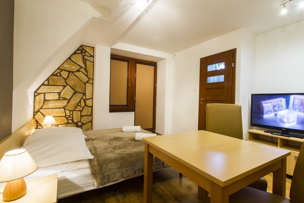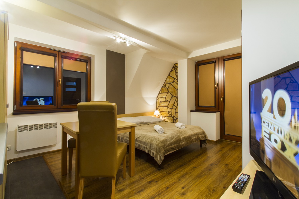 - Salon: Utrzymany w stonowanych barwach: beżach, bielach i brązach, wyposażony w niezbędny sprzęt: telewizor LCD i odtwarzacz DVD zapewni spokojny wypoczynek. Salon posiada wygodny, rozkładany narożnik w naturalnej skórze, miękki dywan Shaggy i piękny szklany stolik kawowy. Z salonu wyjście na balkon. Odpowiedniego klimatu dodają podświetlone reprodukcje z panoramą polskich Tatr: Doliny Pięciu Stawów i Morskiego Oka.