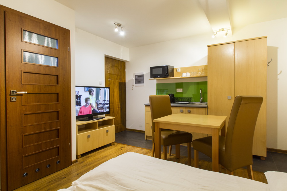 Apartament Duo to nieduży, funkcjonalny i przytulny lokal mieszkalny położony na 1 piętrze budynku. Apartament i jego wyposażenie cechuje estetyka, komfort i nowoczesność- jest on eksploatowany zaledwie od roku. Lokal składa się z niewielkiego salonu połączonego z aneksem kuchennym oraz łazienki z toaletą. W pokoju są dwa pojedyncze łóżka (z możliwością połączenia w łóżko podwójne), dwie szafki nocne z lampkami, stół, dwa fotele i naścienny telewizor LCD 42" ( ponad 20 kanałów standardowych). Lokal posiada bezpośredni dostęp do internetu (wi-fi ). Okno tarasowe wyposażone jest w roletki. W lokalu są dwa grzejniki ścienne (pokój/ łazienka) z ręczna regulacja mocy. Ogrzewanie wody - za pomocą wysokowydajnego ogrzewacza przepływowego.